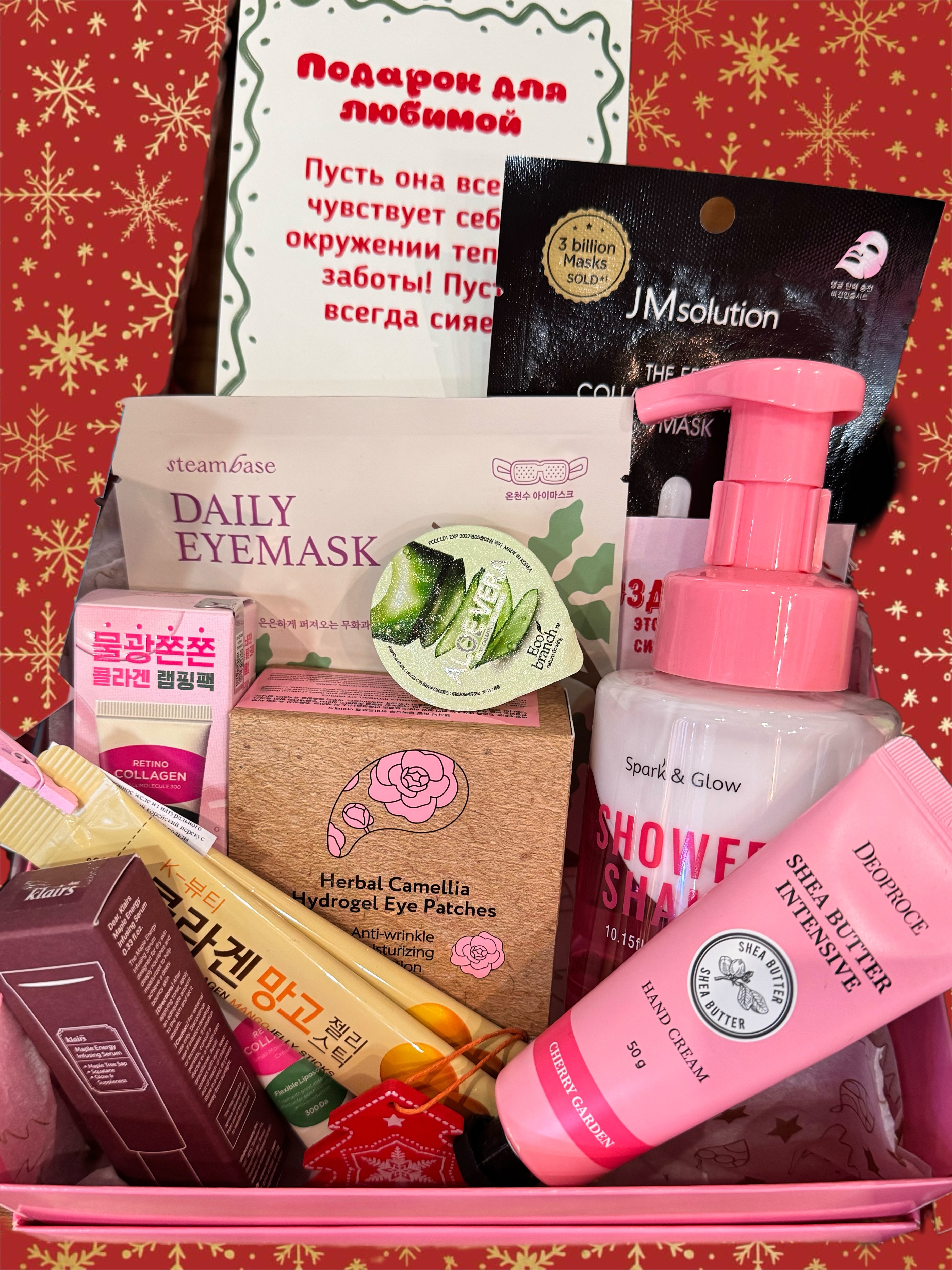 • двухфазный гель для душа с ароматом сладкой гуавы, крем для рук, сыворотка с кленовым сиропом для лица, патчи вокруг глаз с экстрактом камелии, питьевой коллаген с манго, маска для лица, гель алоэ, крем для лица с коллагеном в миниатюре, маска для глаз. Набор упакован в красивую коробку и украшен новогодней игрушкой
